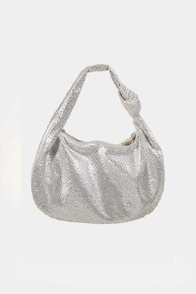 This bag introduces a unique rhinestone studded hobo style. Immerse yourself in the world of understated glamour as this accessory effortlessly exudes timeless appeal.